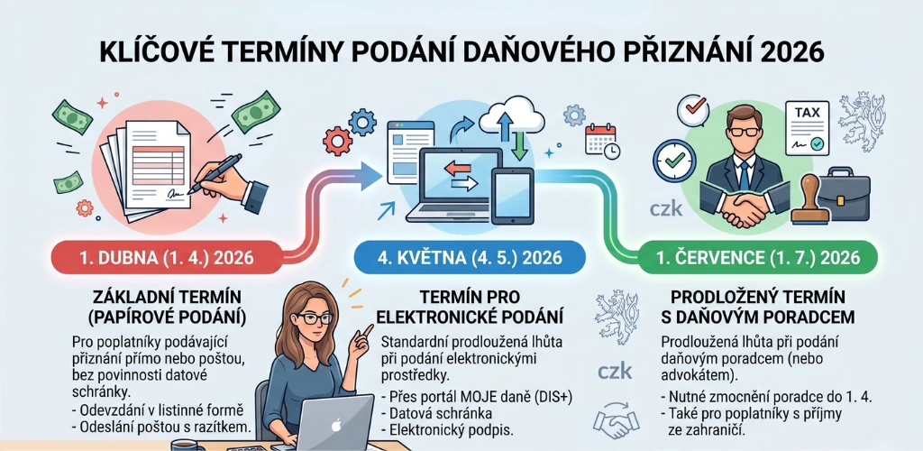 - 4. května 2026 – elektronické podání (přes datovou schránku nebo portál MOJE daně)