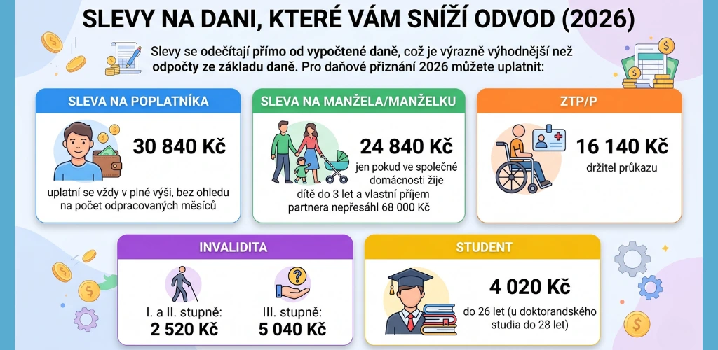 Slevy se odečítají přímo od vypočtené daně, což je výrazně výhodnější než odpočty ze základu daně. Pro daňové přiznání 2026 můžete uplatnit: